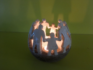 2016Raku.gestookte bol met koperen deksel en houten handvat. Ook van binnen prachtige kleuren koper.
